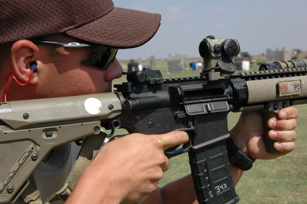 Mike Jones, Alliance, Ohio SWAT cop with #38. Mike and his guys were solid shooters, and his facility likewise great. #38 has CTR stock, Aimpoint T1 M4s in LaRue Tactical Mount, LaRue FUG, Viking Tactics Sling and Light Mount.