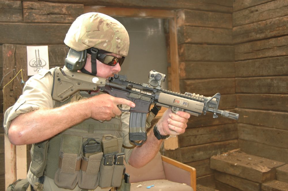 “Toxic” Matt Renz with #39. We replaced the Aimpoint M4s with an Aimpoint T1 in a prototype Matech M249 Mount. Matt’s unique ability to make functional items nonfunctional provided the manufacturer with solid information.