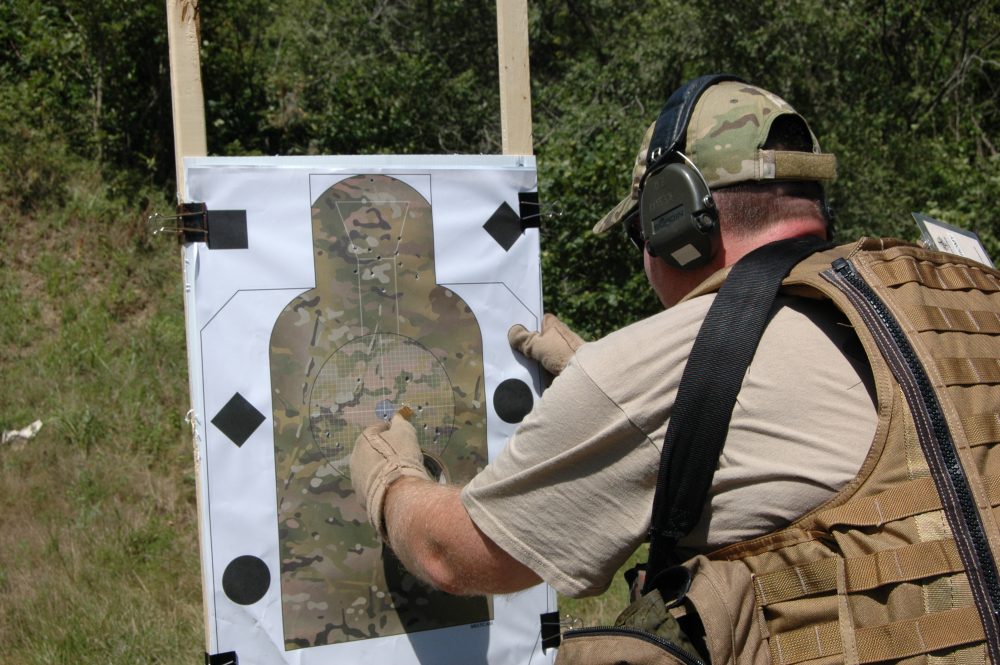 Military has come a long way in training since the war started. A lot of training now takes place at closer ranges, rather than starting at 200 yards and more. This target is old school, back in the days when people shot from the hip with their off hand in their pocket. While the kill zone is generous, this Marine has to compensate for offset with his M4 Carbine at three yards.
