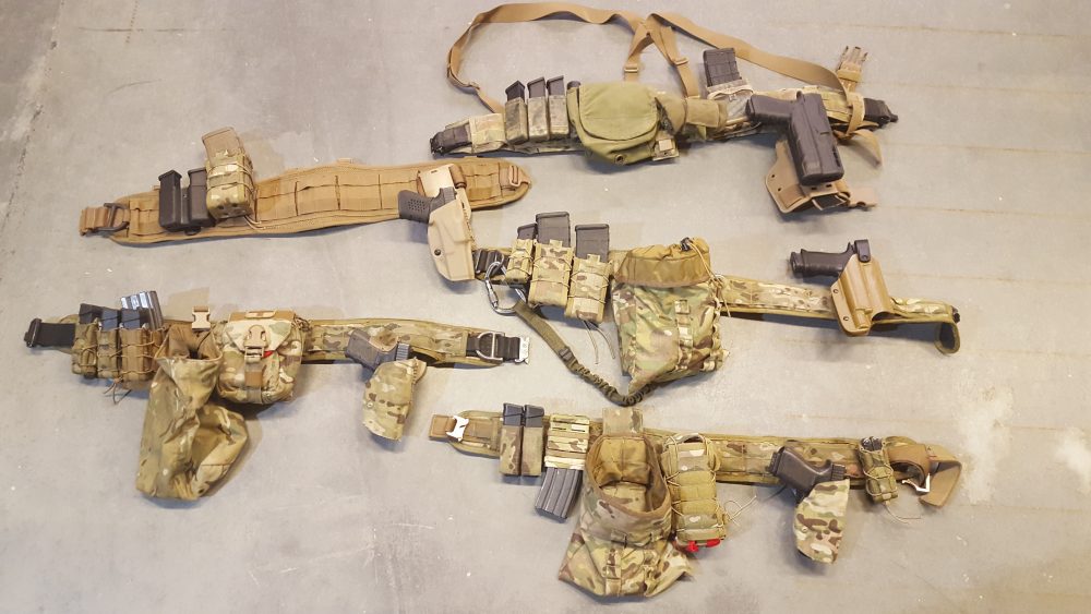 Five battle belt set-ups from different assaulters. Minimal amount of spare magazines on each belt indicates they are using their belts just to supplement their combat loads. All but one has a dump pouch attached.